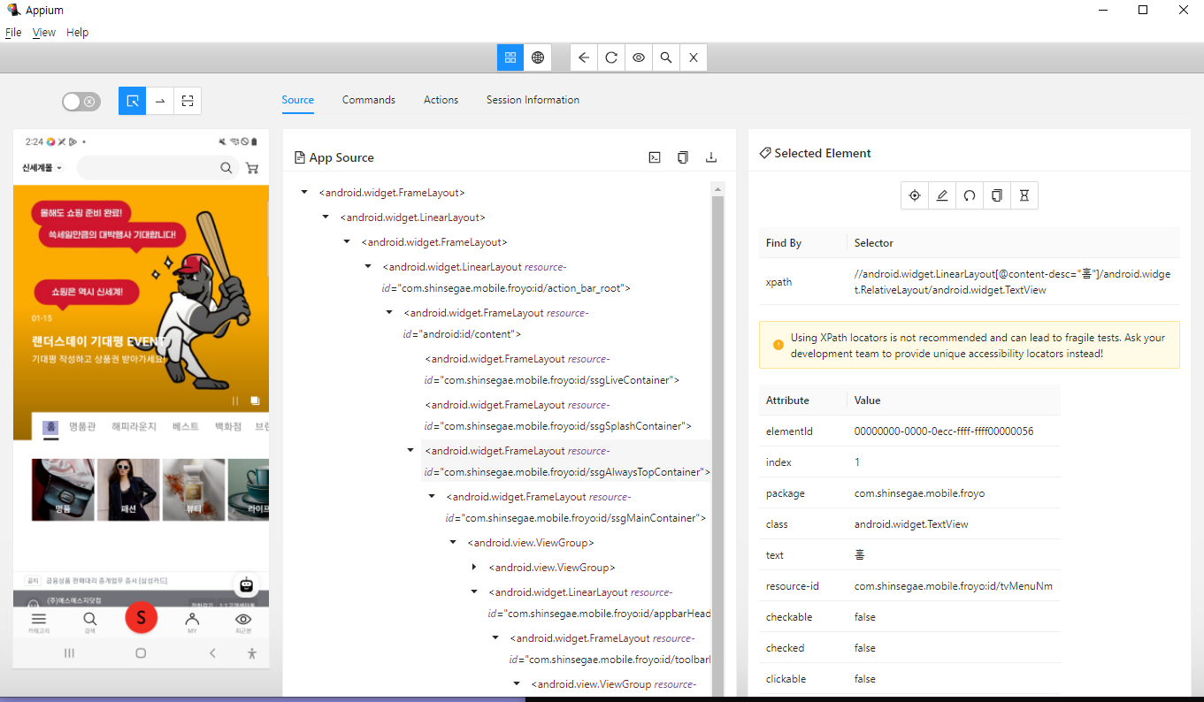 Inspector 연결되었다면, 실행되고 있는 앱 첫 화면을 읽어서 보여준다.